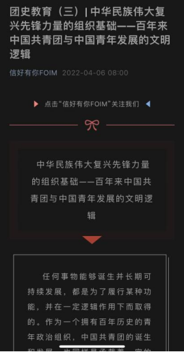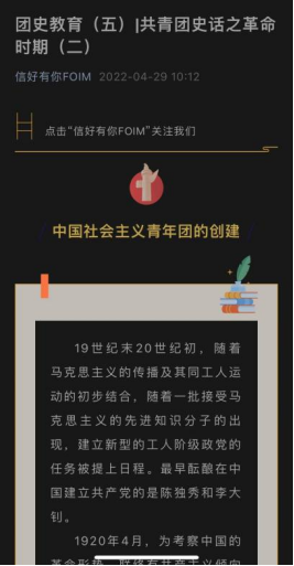 凝聚奋进力量,牢筑信仰之基。太阳成集团tyc7111团委面向青年学生广泛开展团史学习教育,在学院公众号“信好有你FOIM”上开辟“团史教育”专栏,推进理论学习入脑入心,引导青年学史知史,爱团爱党,赓续红色血脉,唱响“请党放心,强国有我”最强音。
